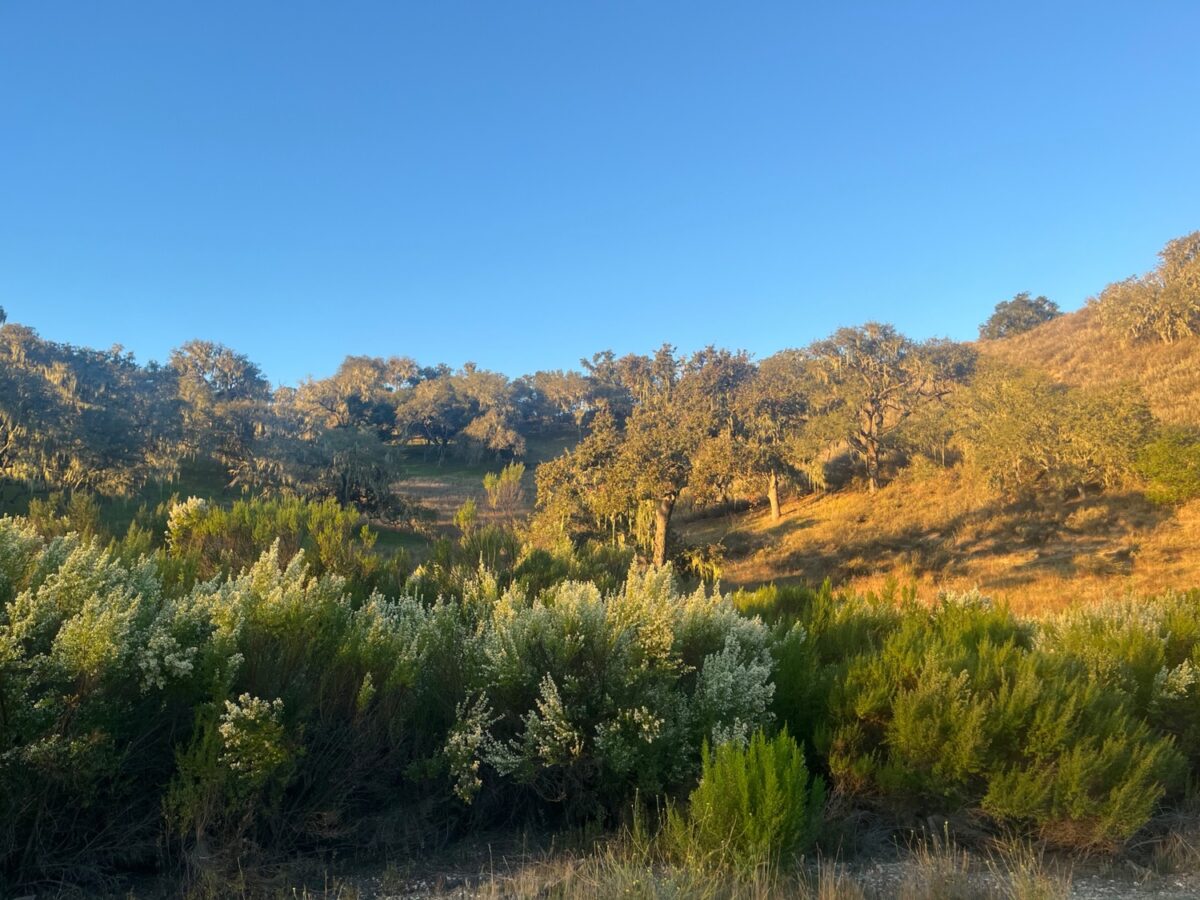 I spent a recent sunrise, bundled up in coat and hat, sitting on the cold earth near a sea of coyote brush (Baccharis pilularis). It was chilly in the valley, but the sun was hinting at a future warmth, lighting up lace lichen in the oaks above. As I appreciated the lichen, I spotted a coyote running in the golden glow of morning. Perhaps this coyote, startled by my presence, came with the intention to scout the edge for a meal. Coyotes and bobcats are regulars around the coyote brush in part due to the abundance of rabbits and birds the thick brush attracts.
