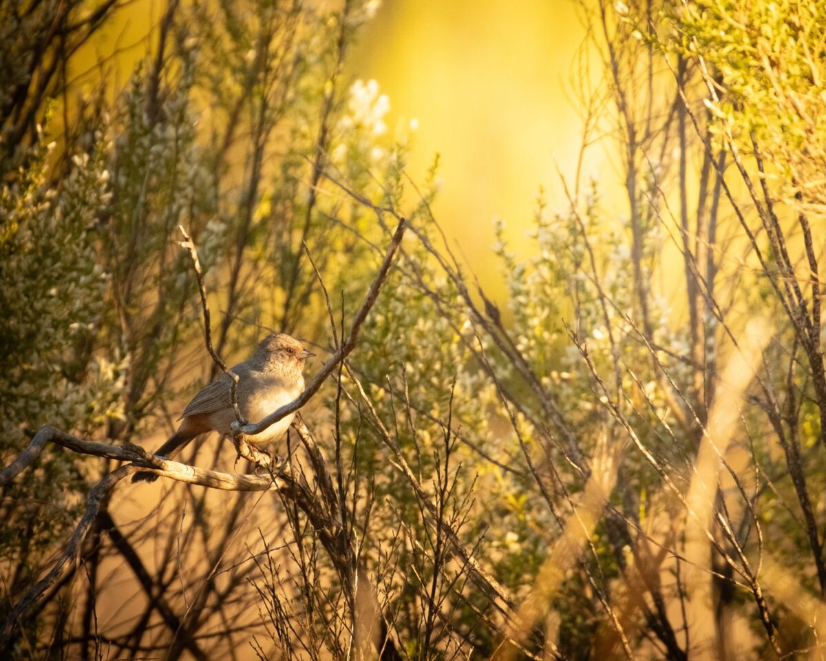 Image 1: California Towhee in the coyote brush. Photo by Nikki Evans.
